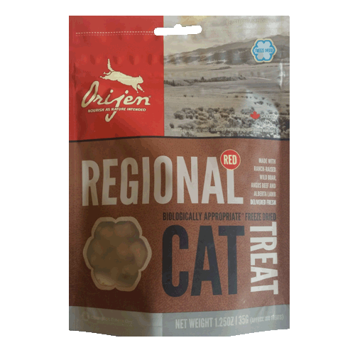 Orijen Freeze-Dried Regional Red Cat TreatsYour cat is a carnivore, evolved to thrive on whole prey that perfectly matches her nutrient needs. That's why Orijen treats are made with 100% meat, poultry or fish - all delivered fresh to nourish your cat as nature intended.Ingredients: Boneless Wild Boar, Boneless Beef, Boneless Lamb, Wild Boar Liver, Lamb Liver, Beef LiverGuaranteed Analysis: Crude Protein (min.) 40%, Crude Fat (min.) 40%, Crude Fiber (max.) 1%, Moisture (max.) 2%Calorie Content:Less than 3 calories per treat
